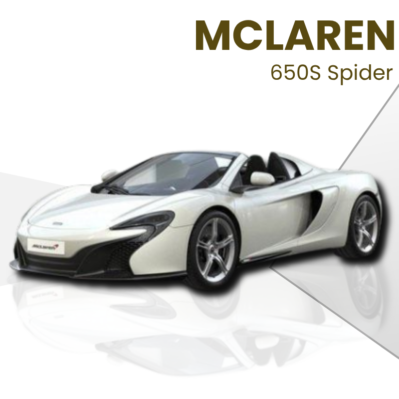 The McLaren 650S Spider delivers all the blistering performance and precision handling of its coupé sibling, with the added exhilaration of open-top driving. Powered by the same 3.8-litre twin-turbocharged V8 engine producing 641 bhp, it sprints from 0 to 100 km/h in just 3.0 seconds—identical to the coupé—while retaining structural rigidity thanks to its carbon fibre MonoCell chassis. The retractable hardtop roof folds down in just 17 seconds, letting drivers experience the full roar of the engine under open skies. With active aerodynamics, McLaren’s ProActive Chassis Control, and finely tuned suspension, the 650S Spider offers a thrilling yet composed ride whether cruising through city streets or attacking a track. Inside, the cabin features premium materials, advanced infotainment, and a layout that keeps the focus on driving. The 650S Spider is a true supercar that offers the best of both speed and sensation.